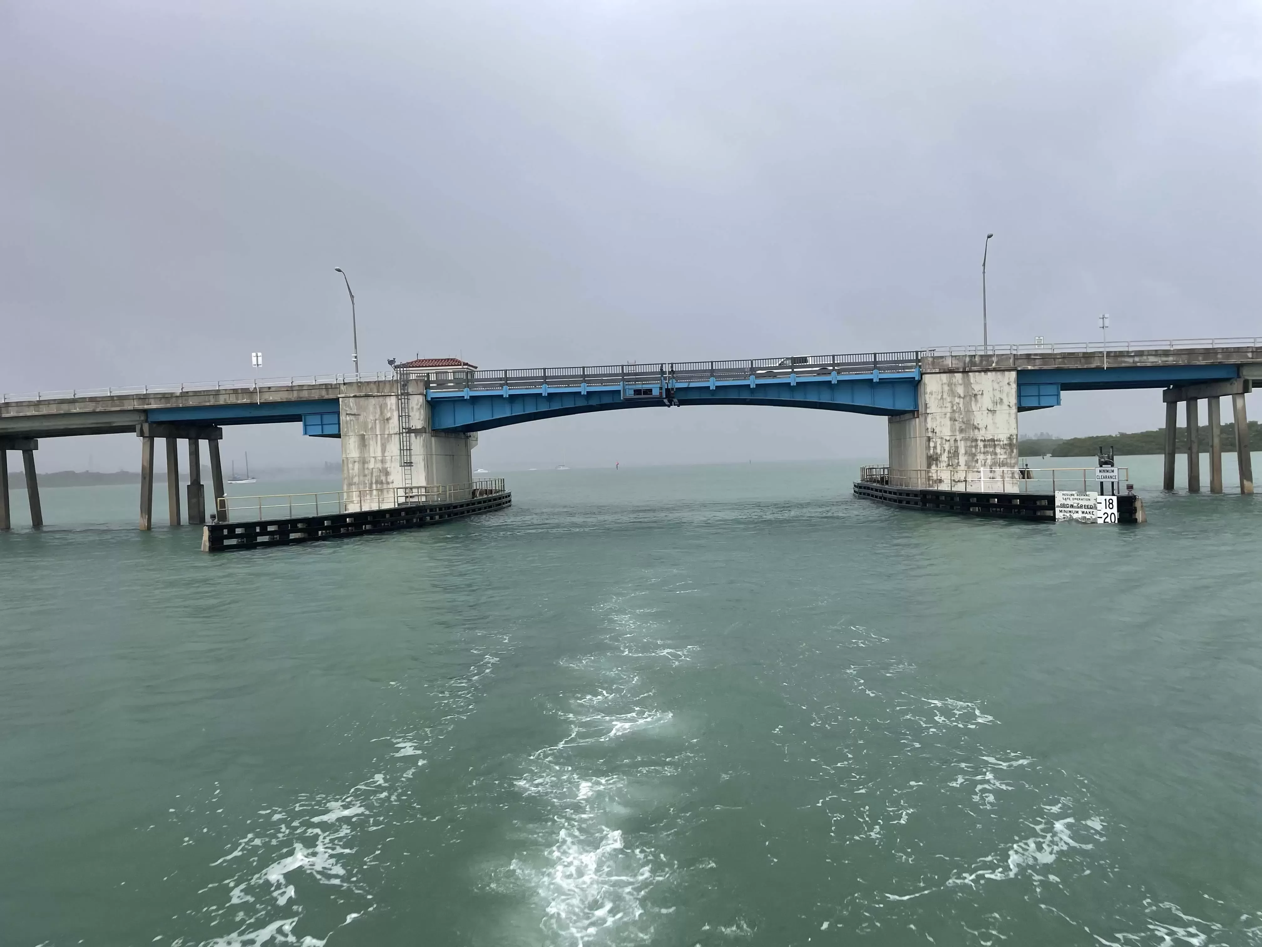 Draft: 5.5'Back story. It’s been 8 years since we waited for a bridge opening. Back then the bridge tenders wanted to hustle you through pronto. Today the bridge tender was mightily displeased that I went though when it was open but before he declared it LOCKED. I guess they must have dropped a bridge on a sailboat in the last eight years ;-)). You may want to ask his permission to proceed.