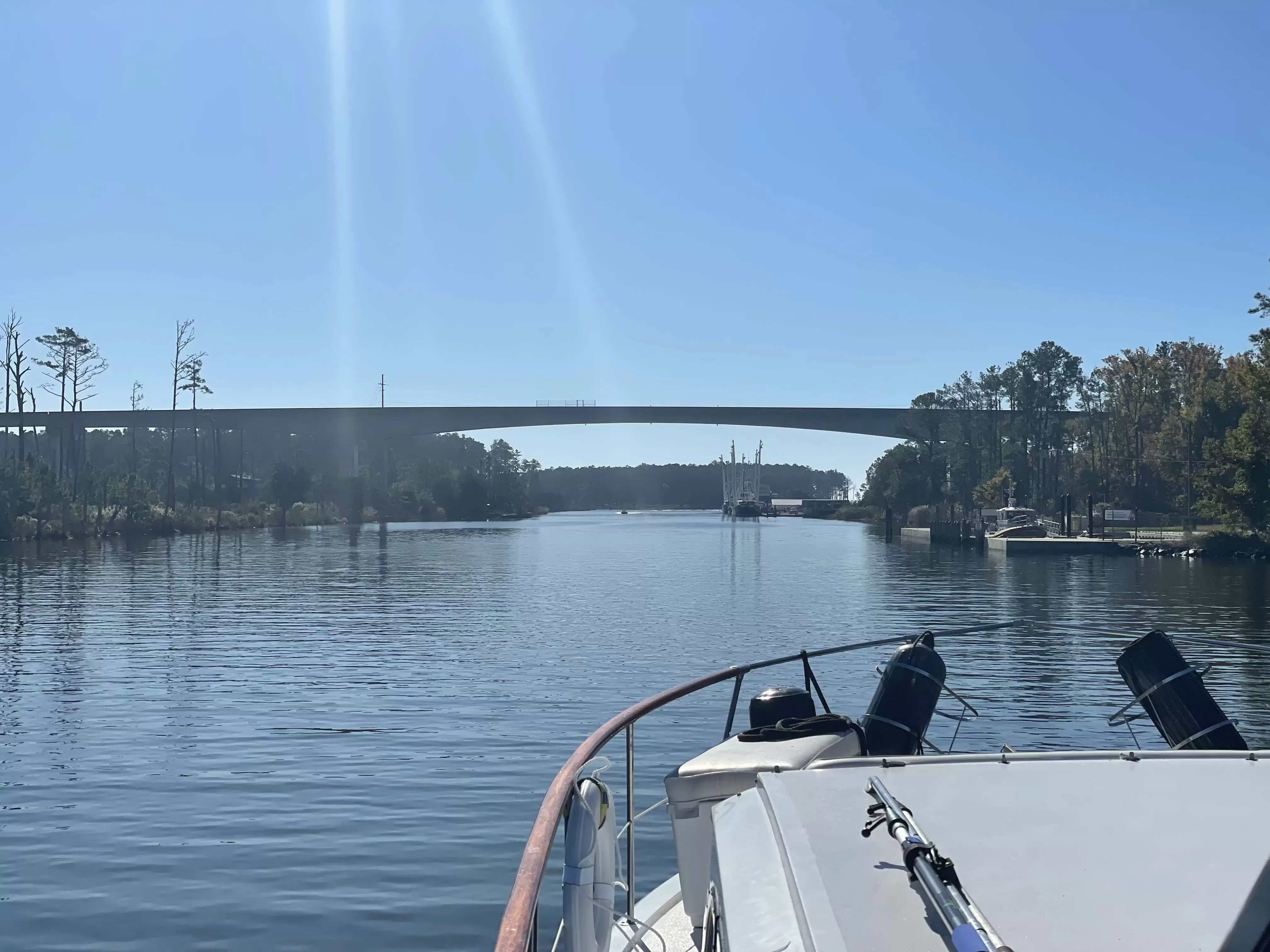 Draft: 4.5'We crossed at neatly low tide. No marker boards. We did not touch at this bridge we did touch with our antenna couple of other bridges south in NC. Air draft 64 ft.