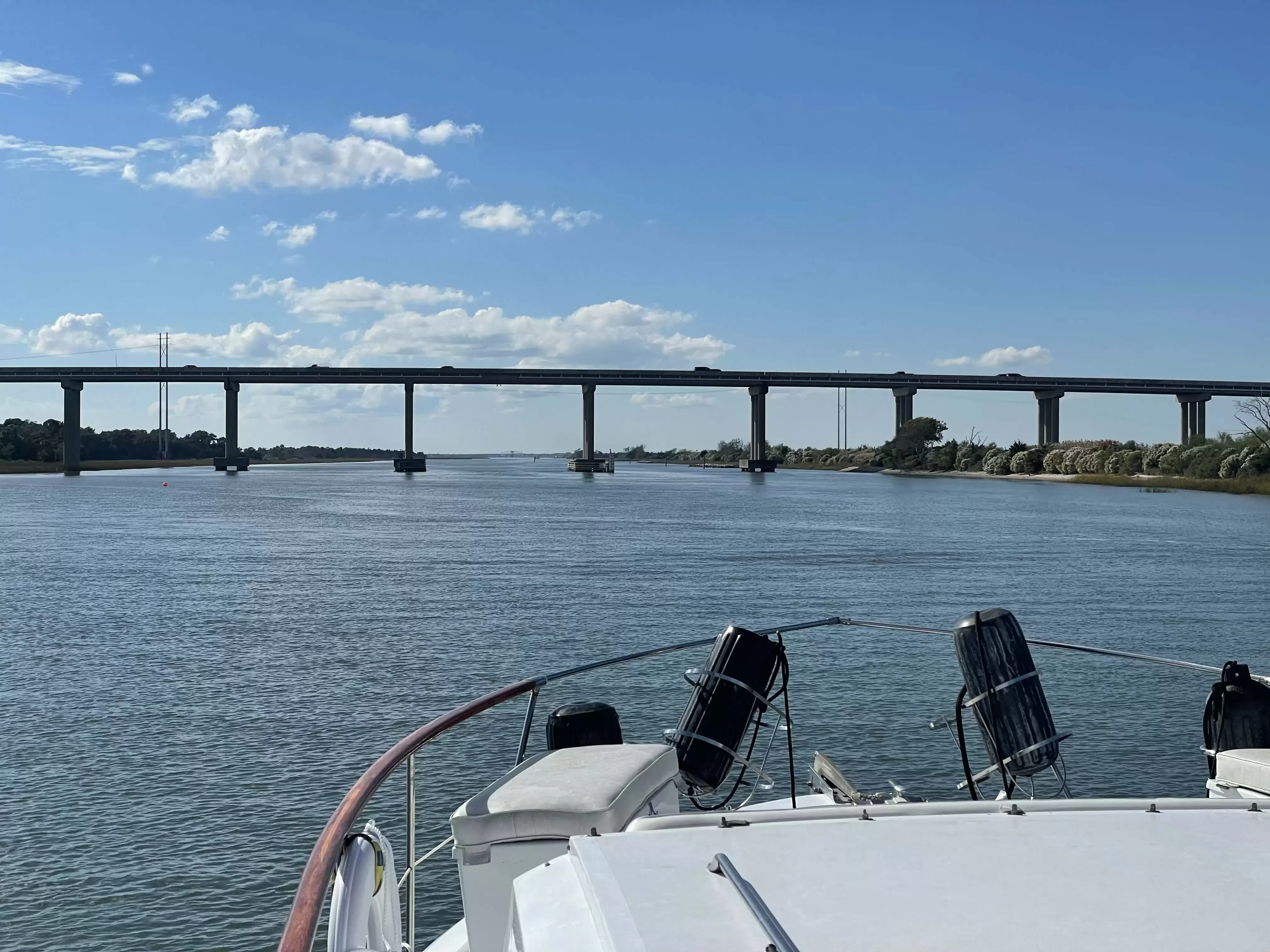 Draft: 5.5'When the Isle of Palms fishing pier gage is at 3.75' the bridge boards read 63.5'. Tide ebbs about 1 ft per hour. Had to wait an hour for clearance, but there was a 20+ kn Northeasterly blowing.